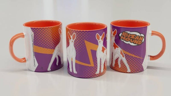 Podenco Ibicenco gladhaar COMIC stijl paars/oranje beker!