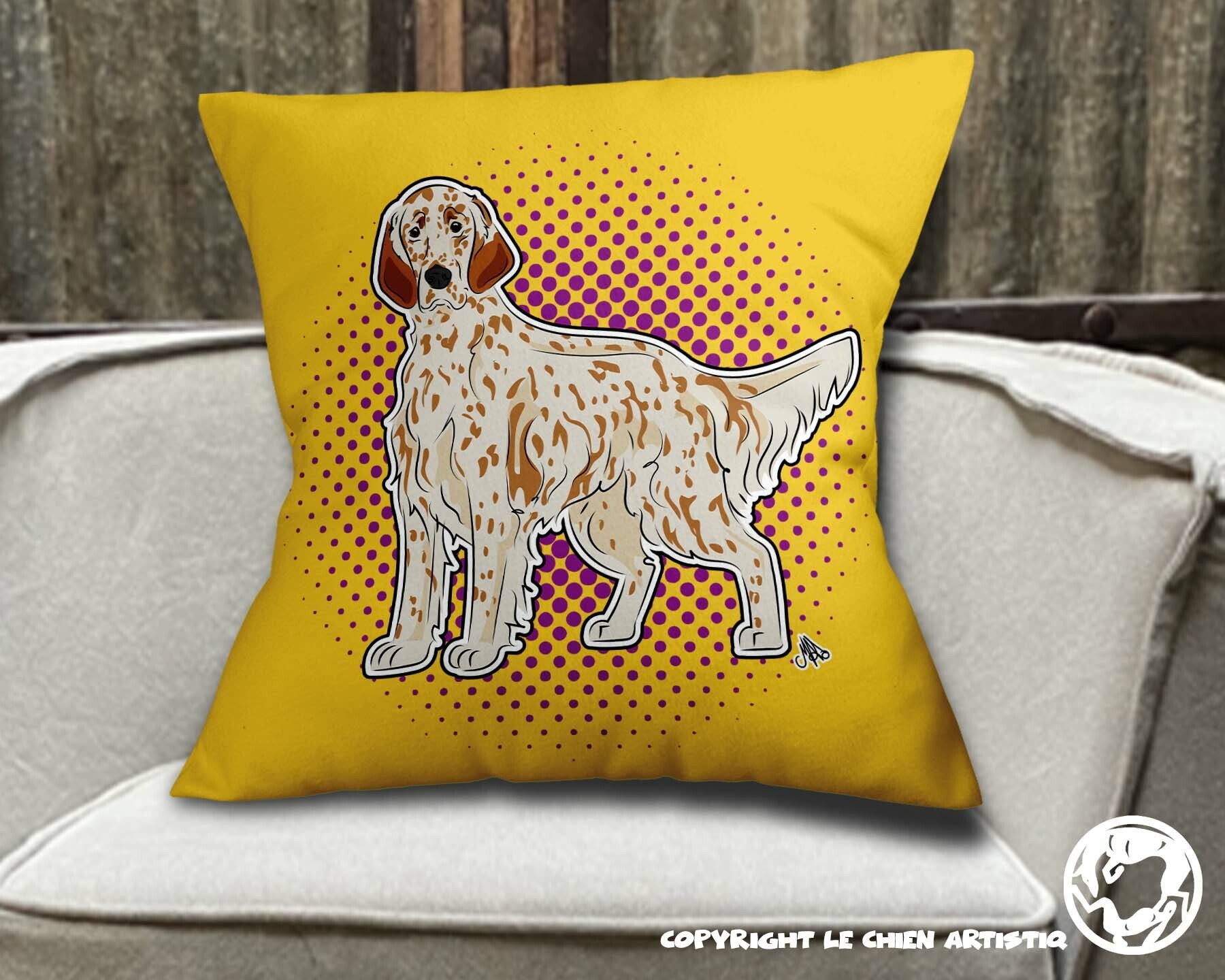 Engelse Setter orange belton ! kussen COMIC stijl ! achtergrond kleur naar keuze !