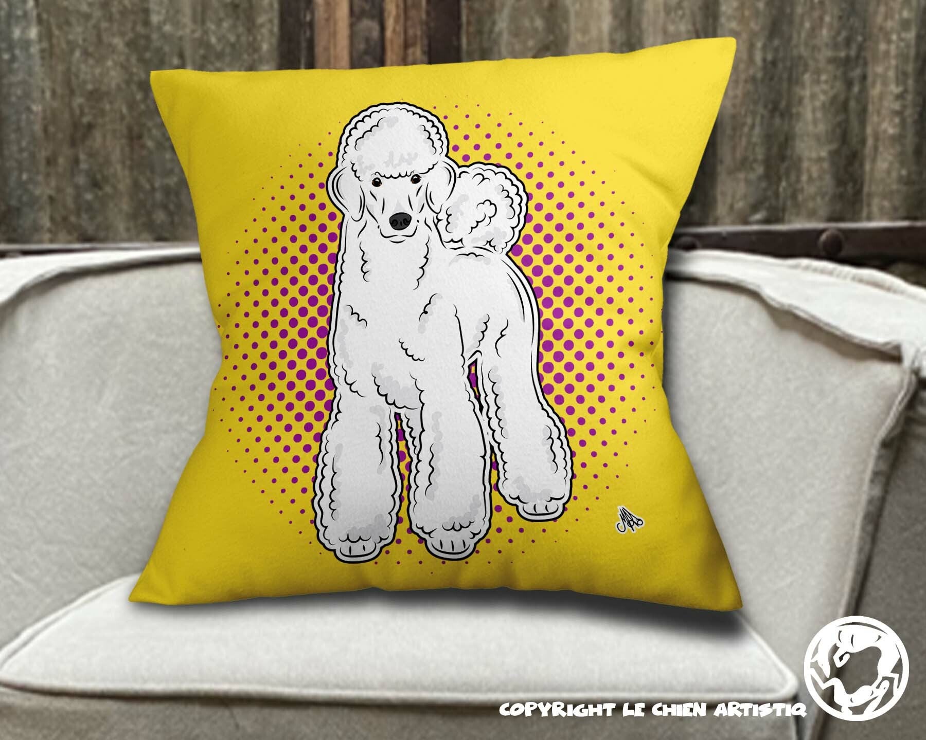 Poedel groot model 2 ! kussen COMIC stijl ! achtergrond kleur naar keuze !