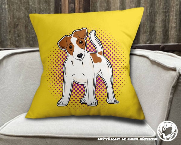 Jack Russell Terrier gladharig ! kussen COMIC stijl ! 2 kleurslagen ! achtergrond kleur naar keuze !