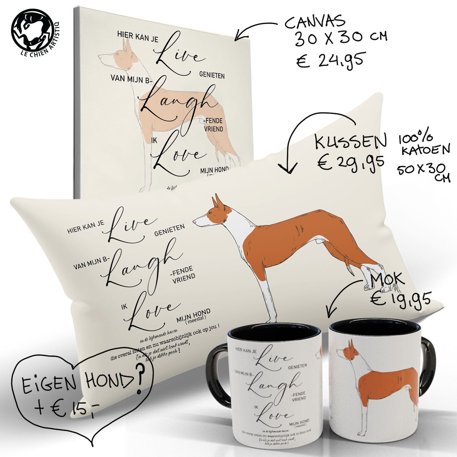 Als losse items te koop of als set, liever je eigen hond? Ik teken jouw hond voor 15 euro extra !